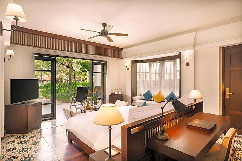 This room offers view of tropical garden from the private balcony. The king bed is fitted with Irish linen and goose down pillows. Each room is equipped with a working desk, seating area, free WiFi, smart TV and bathroom amenities.