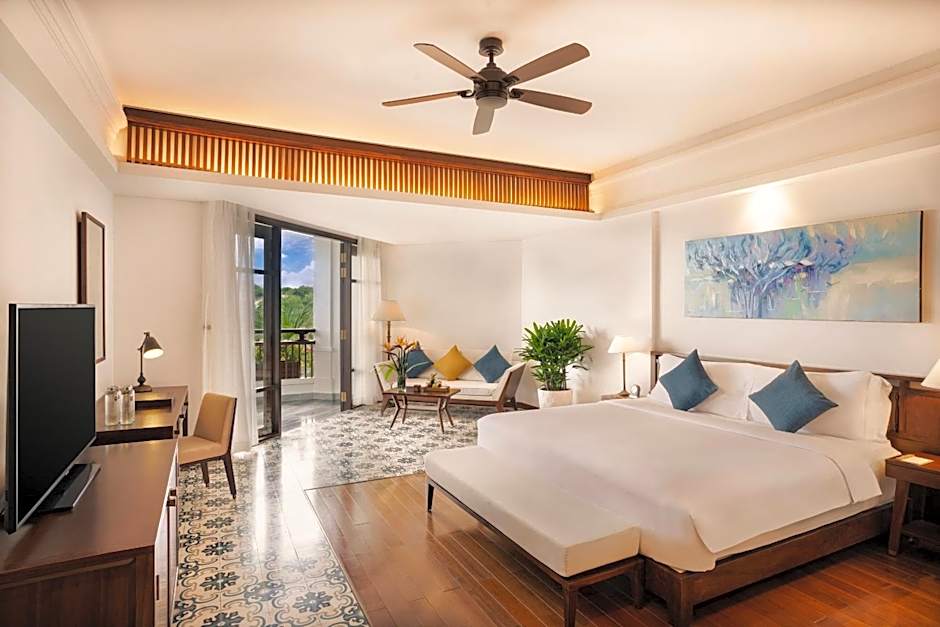 This room offers view of tropical garden from the private balcony. The king bed is fitted with Irish linen and goose down pillows. Each room is equipped with a working desk, seating area, free WiFi, smart TV and bathroom amenities.